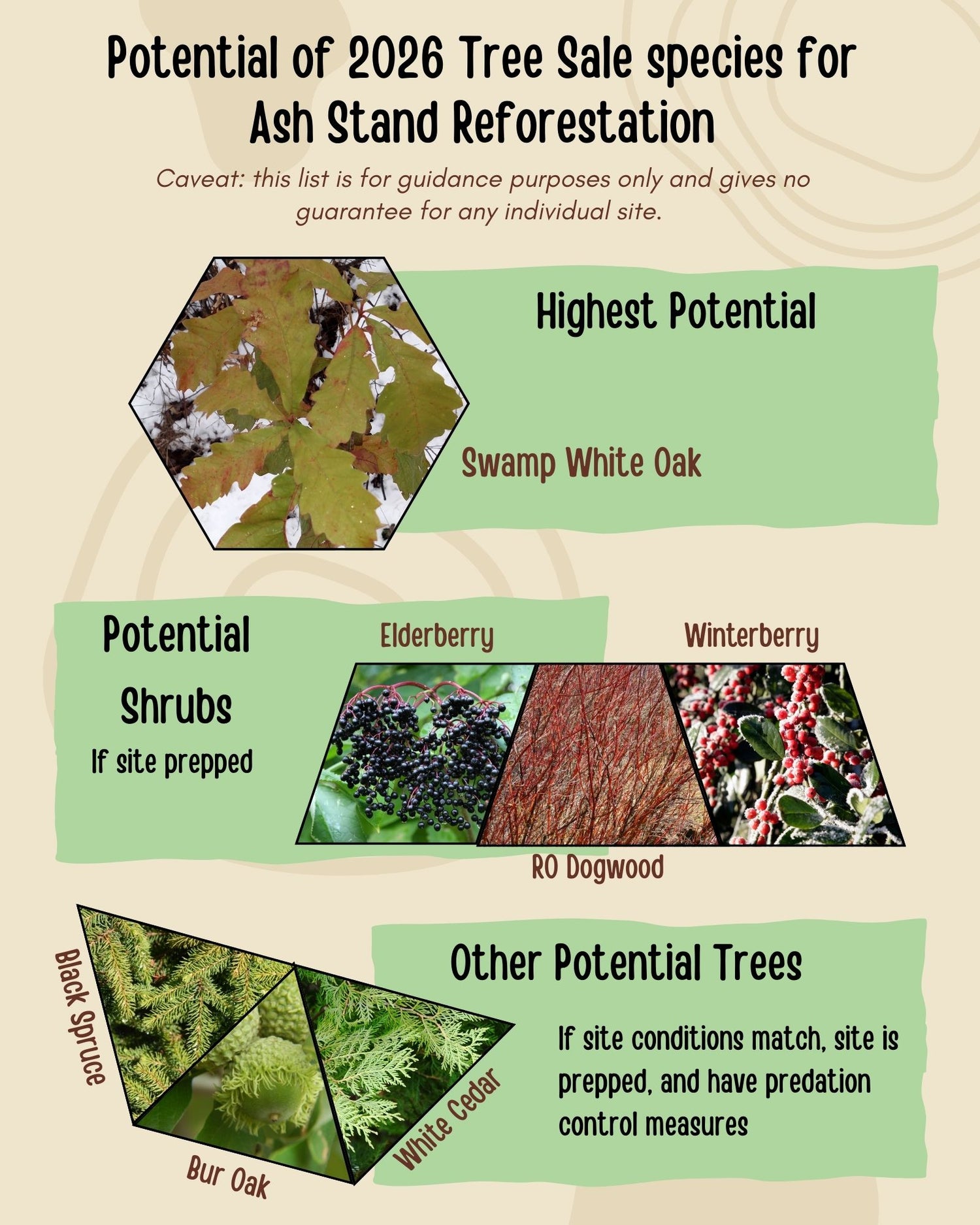 Black Ash forests are more vulnerable to the impact of the Emerald Ash Borer due to the rather high percentage of Black Ash trees present. Without the living ash trees, the forest is likely to convert to a non-forested wetland. Reforestation after an ash harvest thus aids in the overall survival of the forest. However, choosing replacement species depend upon site conditions and management decisions.